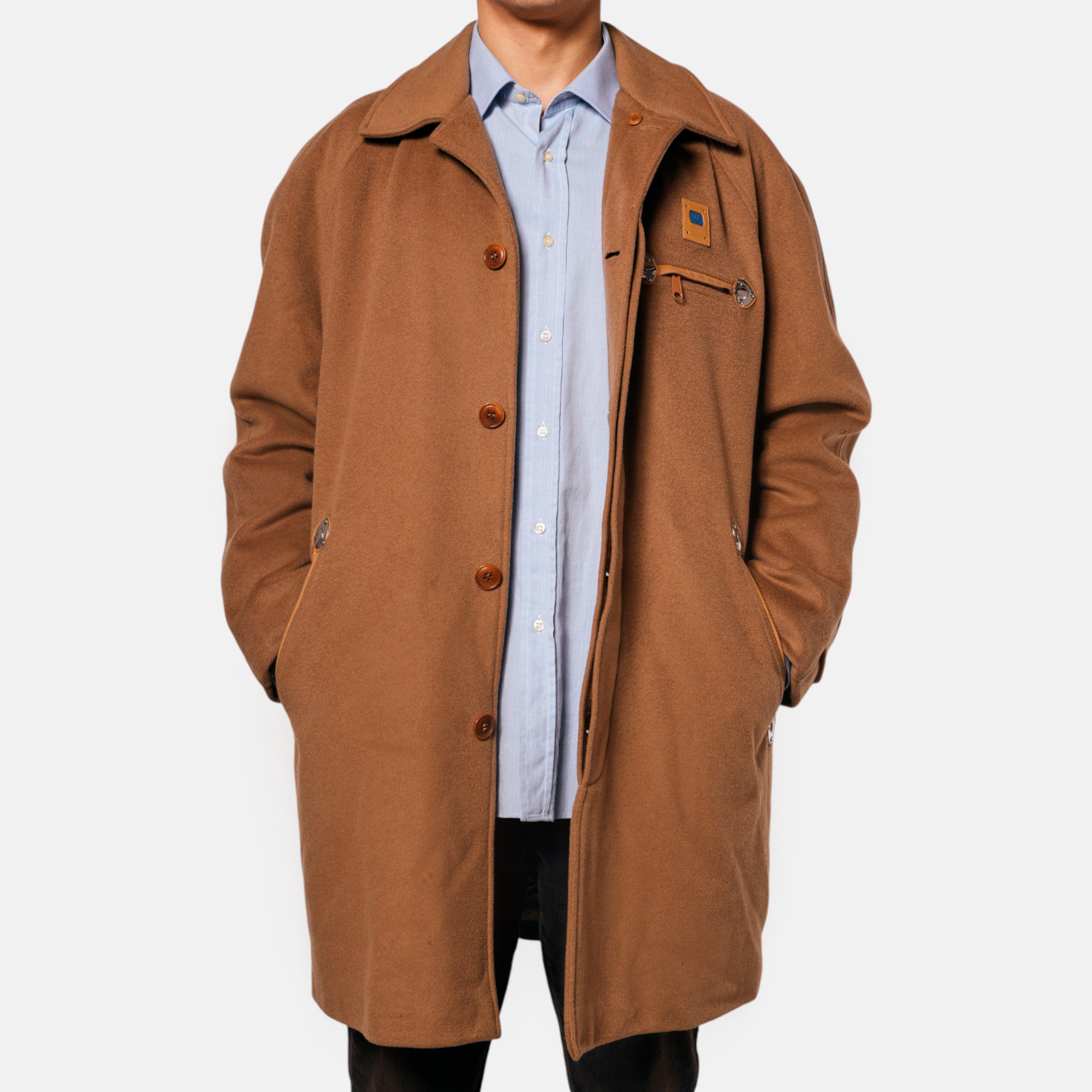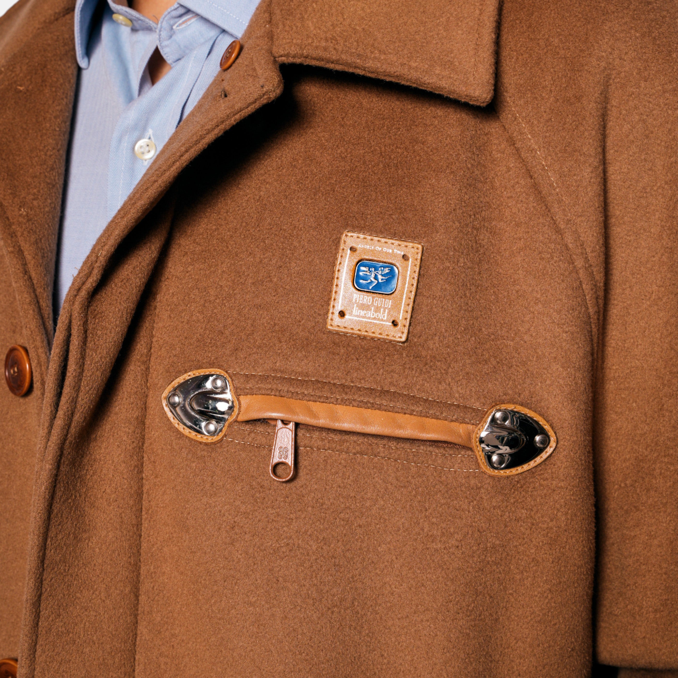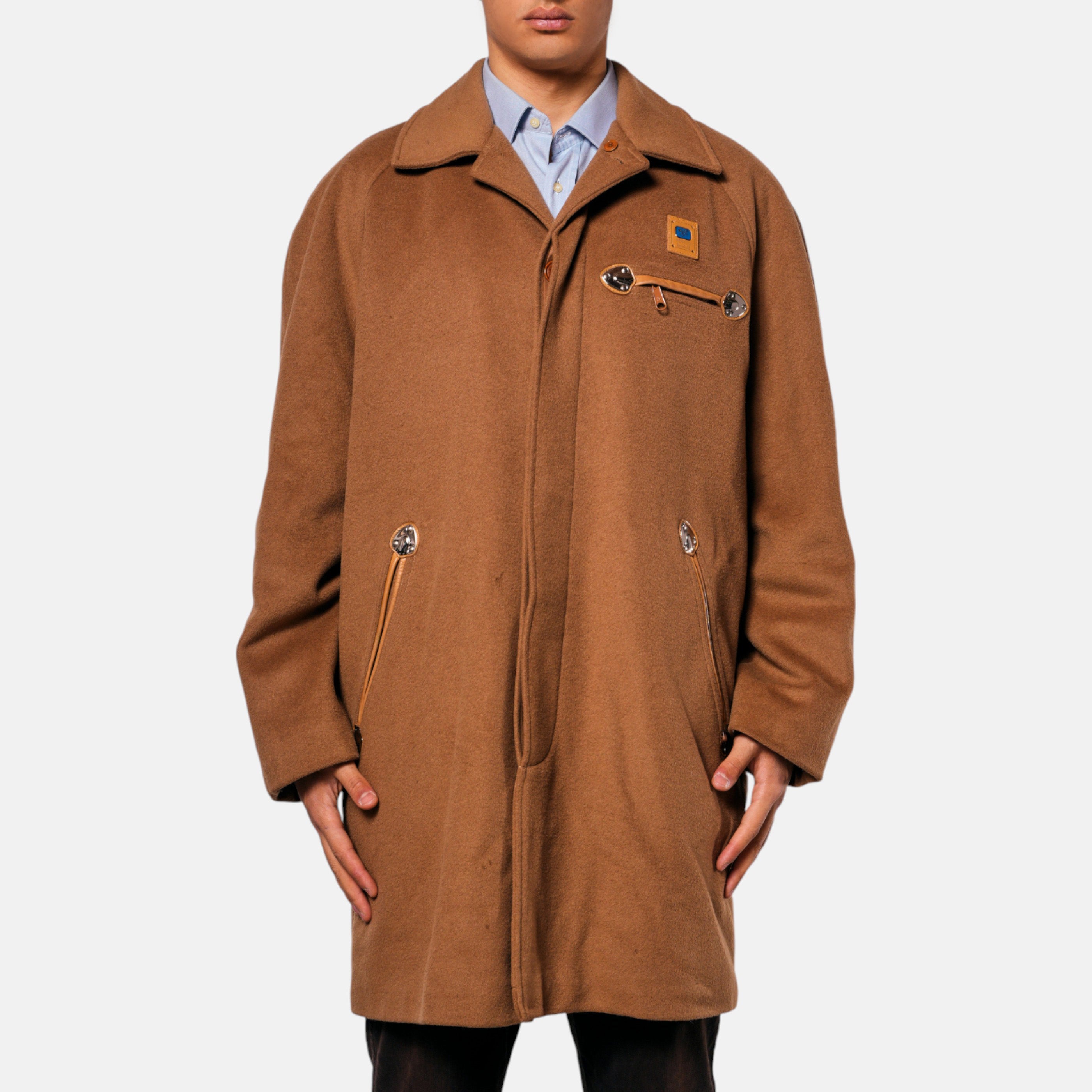 Cappotto dal mood artigianale italiano, ricco di dettagli in pelle e borchie decorative che lo rendono unico.