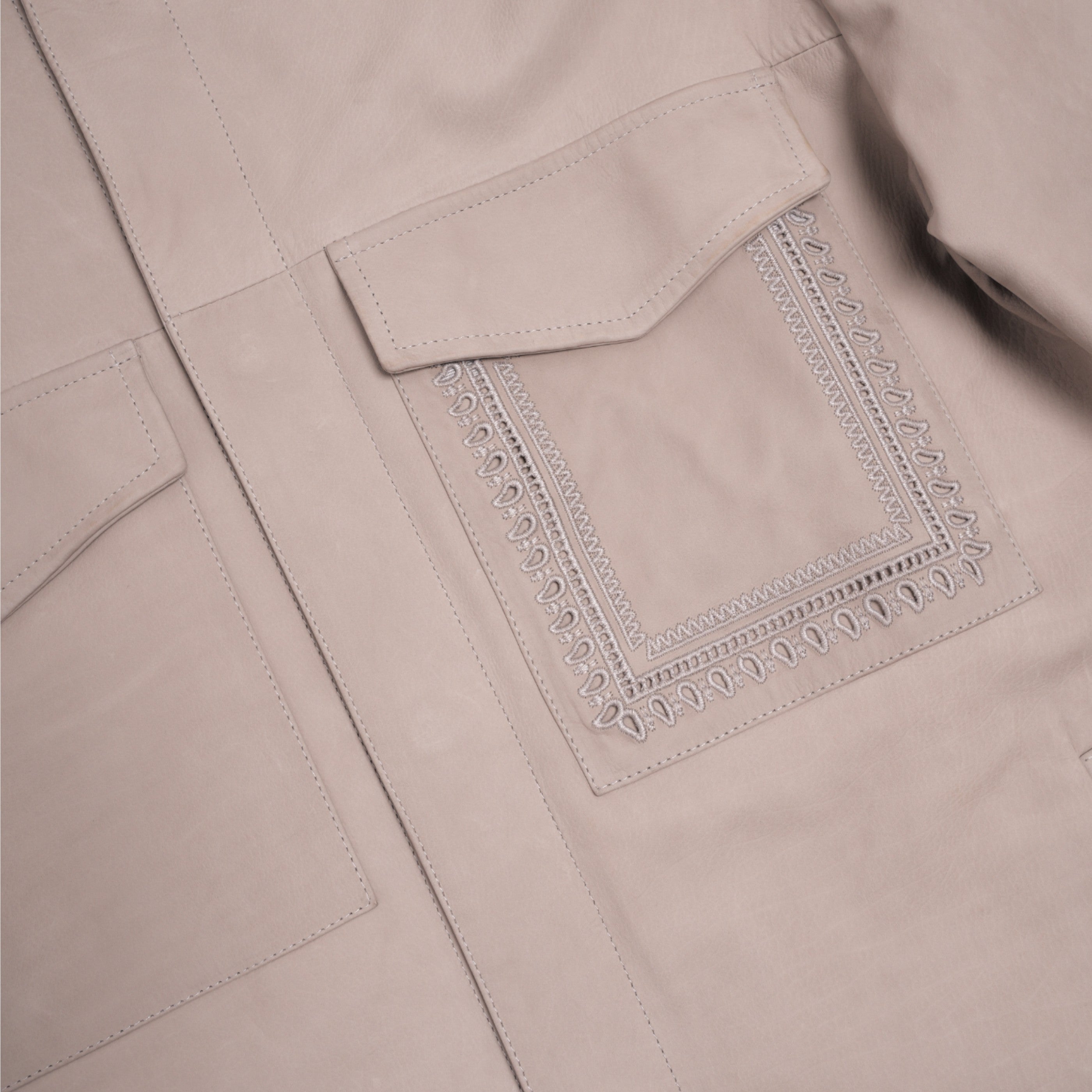 Una delle due tasche a patta sul petto è arricchita da ricami inglesi ispirati alla bandana, mentre la nuca è decorata da quattro micro-borchie Crown Me, che rappresentano le quattro lettere del logo della maison italiana.