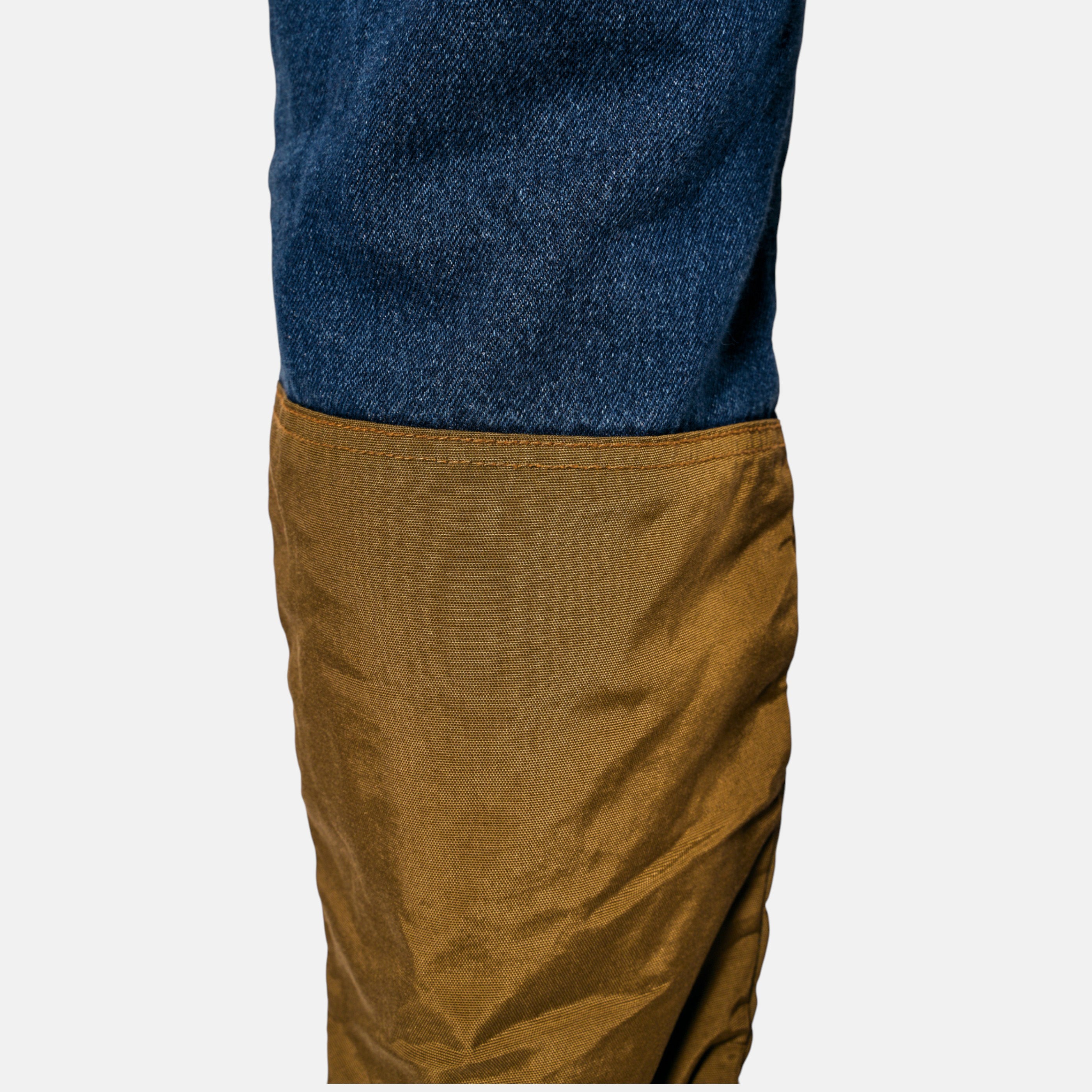 Pantalone Northteste Denim americano personalizzato con inserti tecnici semi-lucidi, dal mood sperimentale e moderno. Perfetti per chi cerca un capo originale che mescola classico e futuristico. Stile street contemporaneo con twist artigianale.